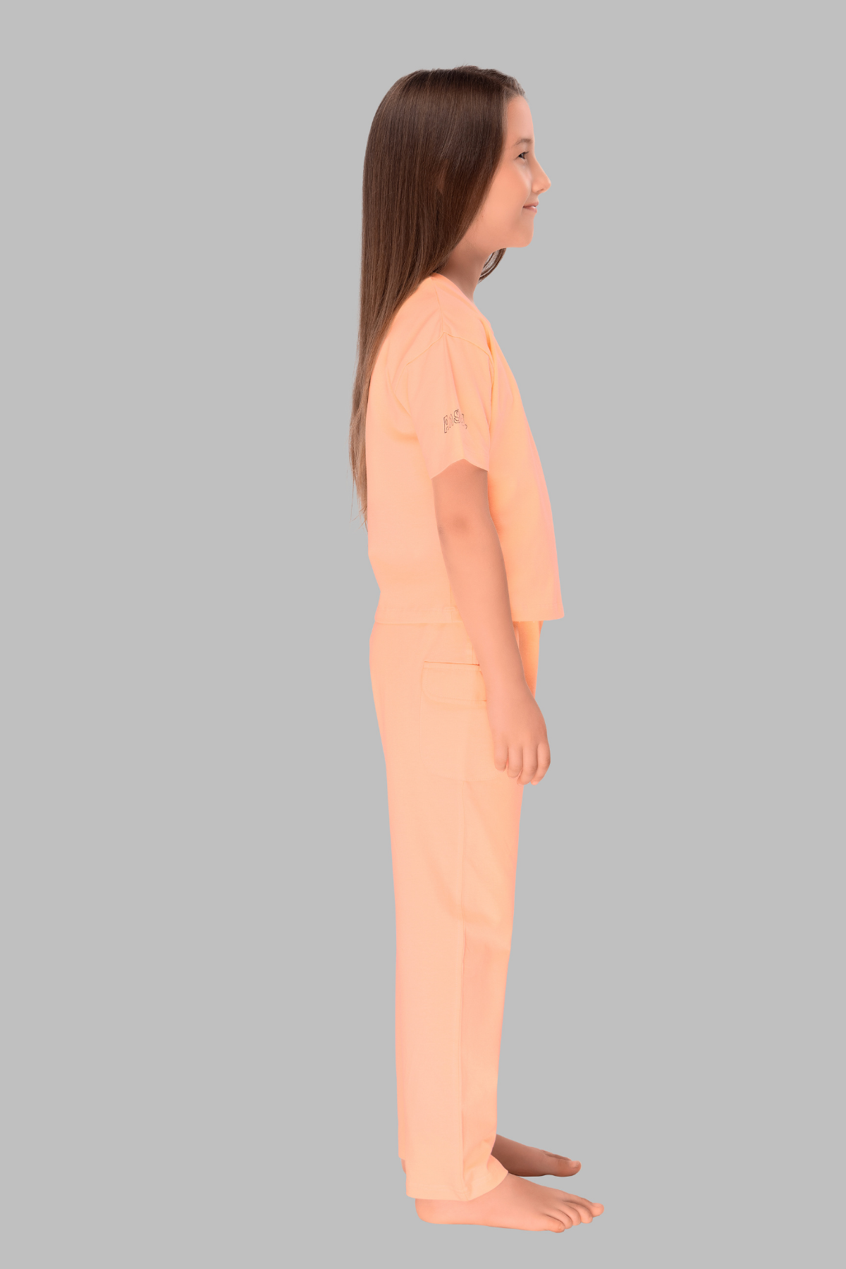 Designed for comfort and style, this lounge set features a solid peach top with a back print and coordinating peach pajamas, making bedtime both cozy and chic.